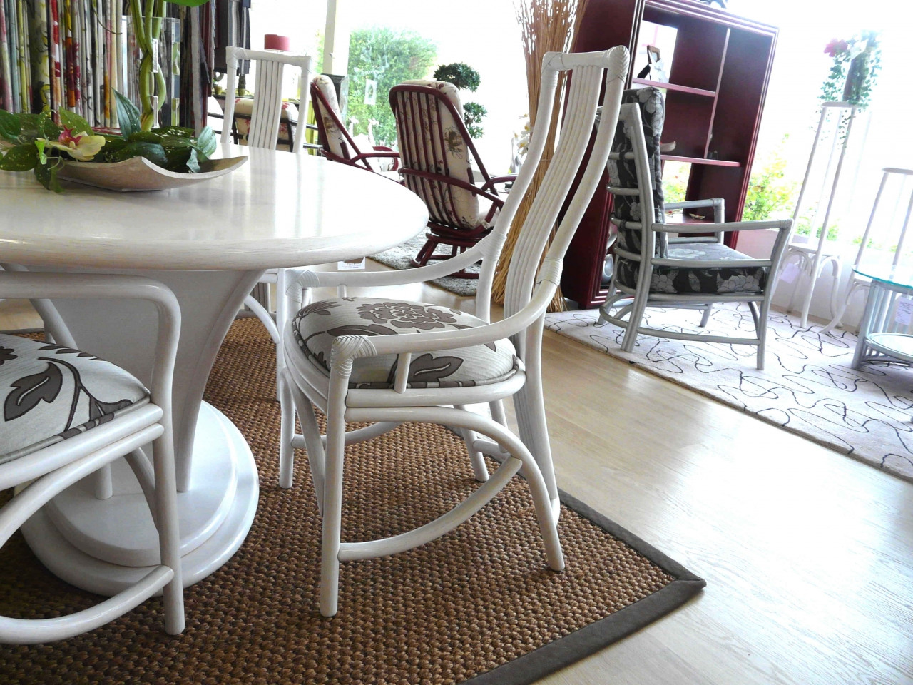 Chaise en rotin teinte blanc essuyé. Tissu Jacquard Chocolat.